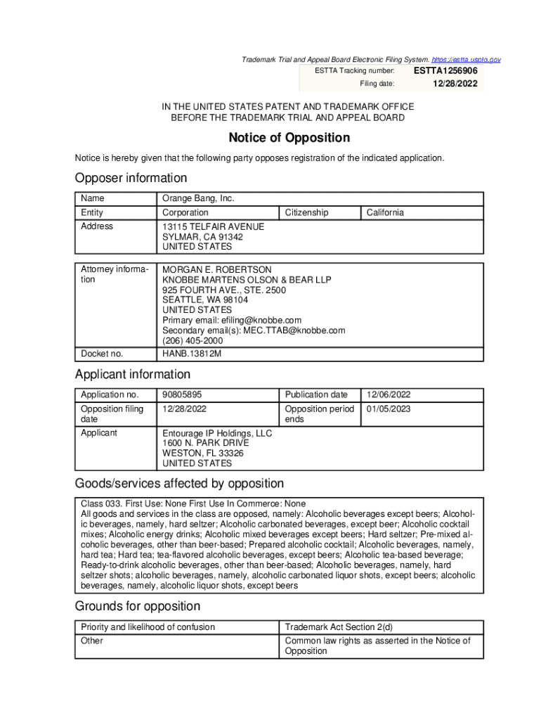 This document is a Notice of Opposition filed by Orange Bang, Inc. against the application for the trademark \'BANG HARD SELTZER\' submitted by Entourage IP Holdings, LLC. The opposition is based on claims of priority and likelihood of confusion, referencing the longstanding use and registration of the BANG marks by the Opposer. The document outlines the grounds for opposition, citing common law rights and specific trademark registrations held by the Opposer.