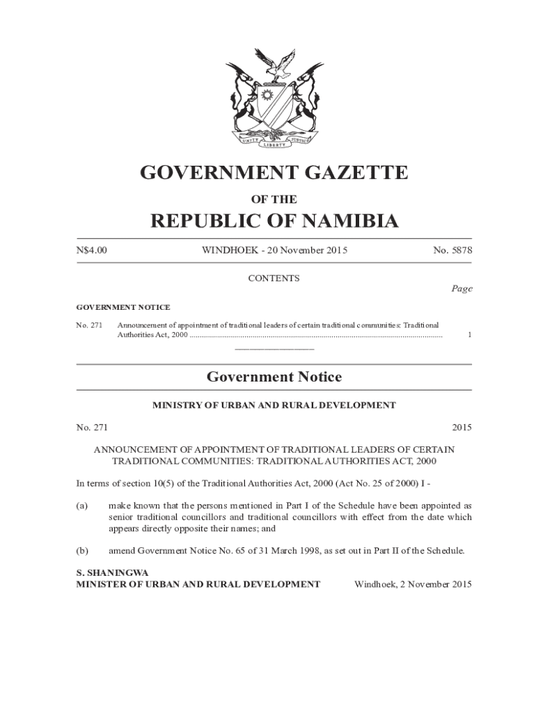 GOVERNMENT GAZETTE OF THEREPUBLIC OF NAMIBIA N$4.00WINDHOEK 20 November 2015No. 5878CONTENTSPageGOVERNMENT NOTICE No. 271Announcement of appointment of traditional leaders of certain traditional communities: