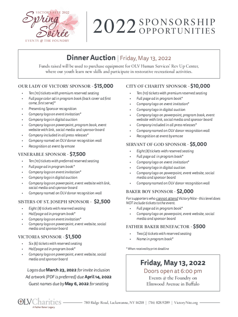 This document outlines the sponsorship opportunities for the Victory Nite 2022 event hosted by OLV Human Services. The event will take place on May 13, 2022, at The Foundry in Buffalo. The funds raised will support the Rev Up Center for youth development and recreational activities. The form details various sponsorship levels, ticketing options, and advertising opportunities in the program book.
