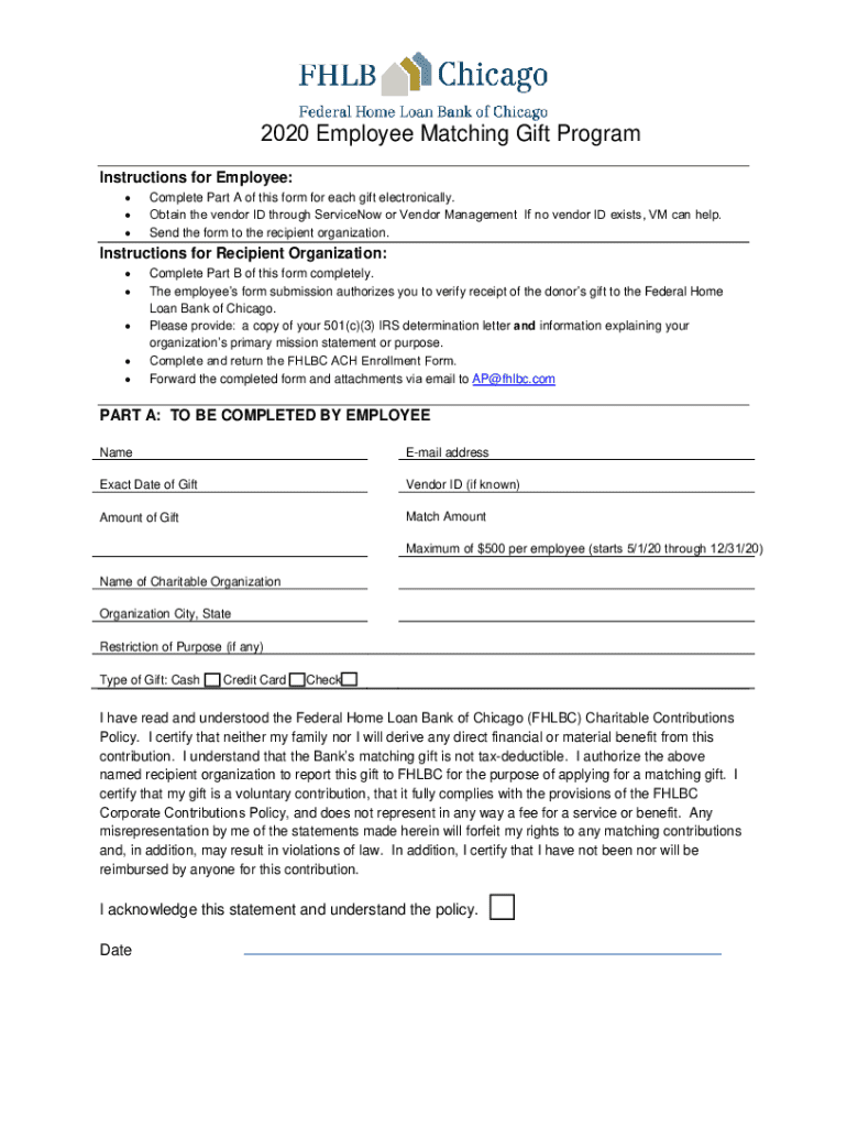 This document provides instructions for employees and recipient organizations on how to participate in the Federal Home Loan Bank of Chicago\'s Employee Matching Gift Program. It includes steps for completing the form, necessary information required from both employees and charitable organizations, and details about the matching contributions policy.