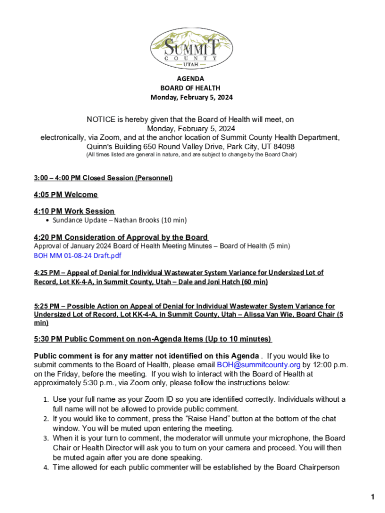 AGENDA BOARD OF HEALTH Monday, February 5, 2024 NOTICE is hereby given that the Board of Health will meet, on Monday, February 5, 2024 electronically, via Zoom, and at the anchor location of Summit