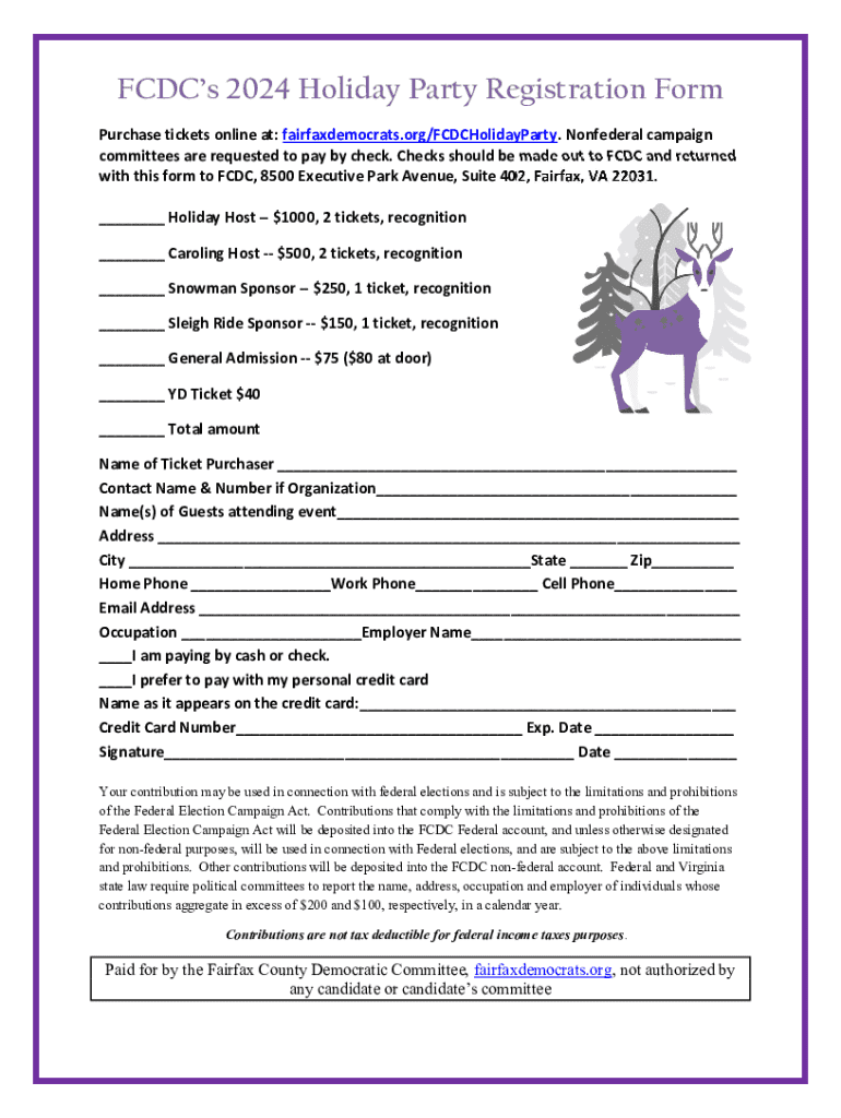 This form is for registering and purchasing tickets for the FCDC\'s 2024 Holiday Party. Various sponsorship options and general admission tickets are available, along with details for payment and contribution regulations.