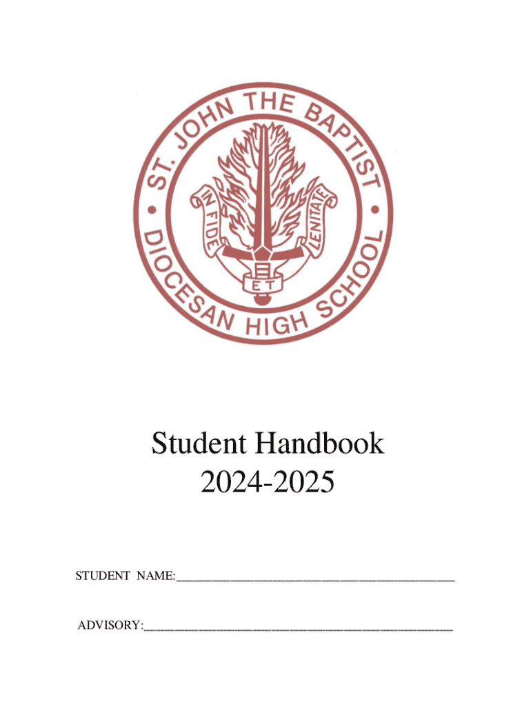 This handbook provides comprehensive guidelines and policies for students attending St. John the Baptist Diocesan High School for the academic year 2024-2025. It covers important topics such as attendance, academic integrity, dress code, student behavior, and health services, ensuring a safe and conducive learning environment that aligns with the school\'s mission and values.