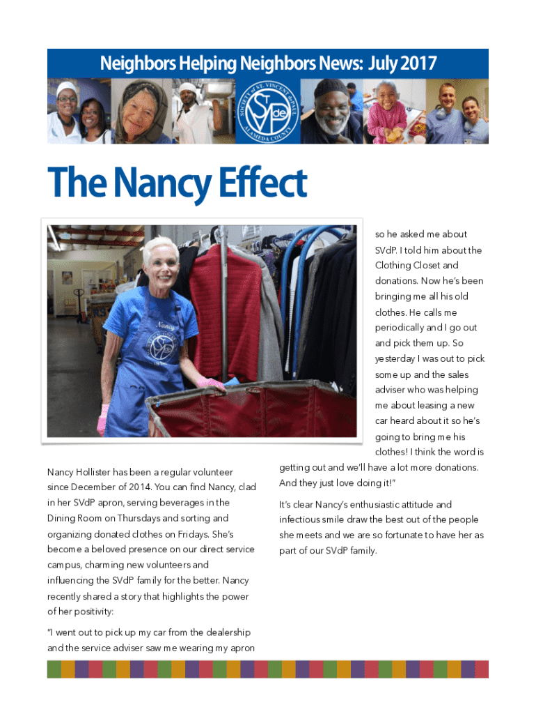 This edition highlights the volunteer efforts of Nancy Hollister, details upcoming meetings and events, and discusses the collection of school supplies for families in need. It also features stories of community support, including a Thanksgiving in June event hosted by the Oakland A\'s and the welcome of new staff members. Additionally, it showcases volunteer opportunities and community engagement initiatives.