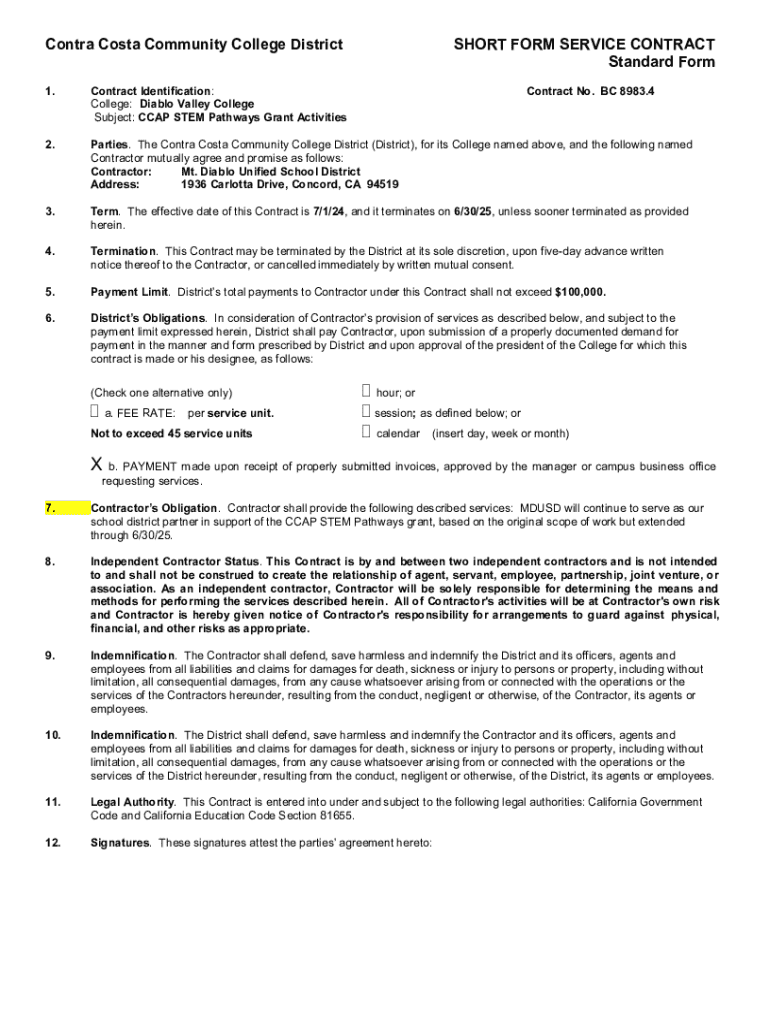 This document outlines a service contract between the Contra Costa Community College District and Mt. Diablo Unified School District to support CCAP STEM Pathways Grant activities. It includes details on contract identification, parties involved, term, payment limits, obligations of both parties, and legal authority under California law.