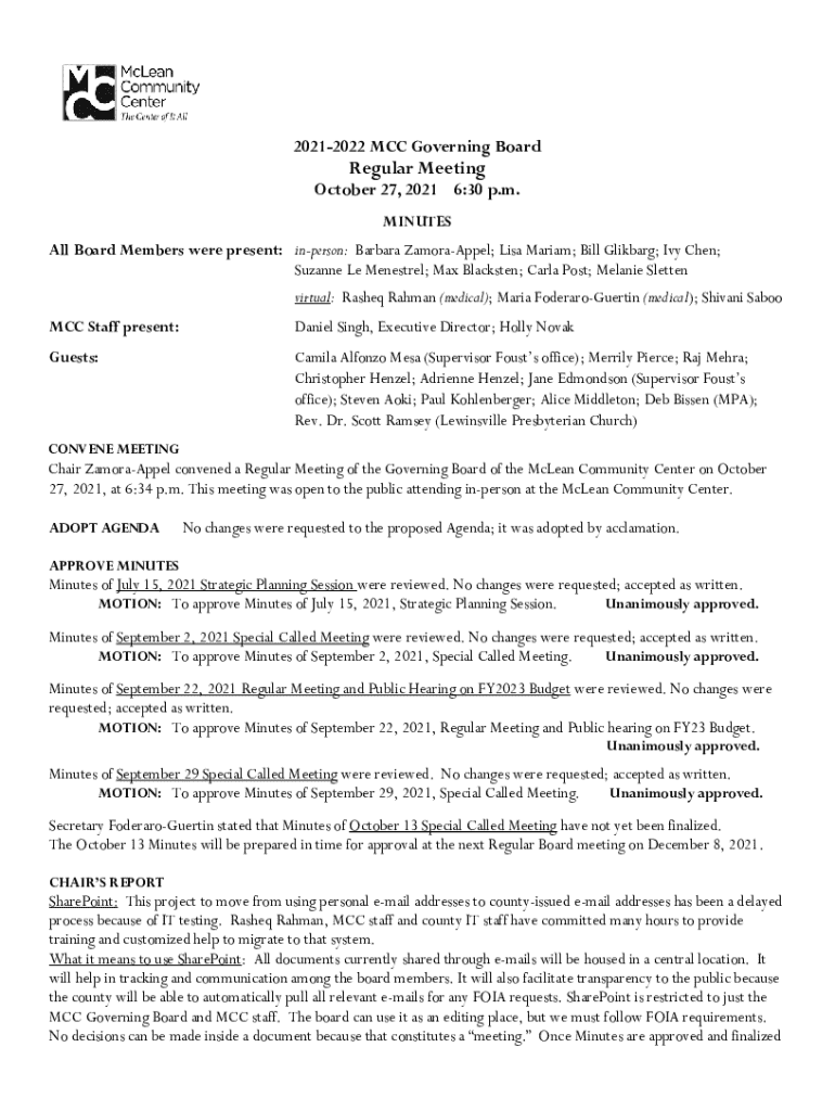 20212022 MCC Governing BoardRegular MeetingOctober 27, 2021 6:30 p.m. MINUTES All Board Members were present: inperson: Barbara ZamoraAppel; Lisa Mariam; Bill Glikbarg; Ivy Chen; Suzanne Le Menestrel;