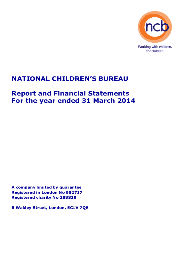 This document presents the annual report and financial statements of the National Children\'s Bureau (NCB) for the year ending March 31, 2014. It outlines the achievements, challenges, and financial performance of the organization, which focuses on improving the lives of children and young people, particularly the most vulnerable. The report includes strategic objectives, governance structure, financial review, and future plans as part of NCB\'s commitment to ensuring children\'s rights and...