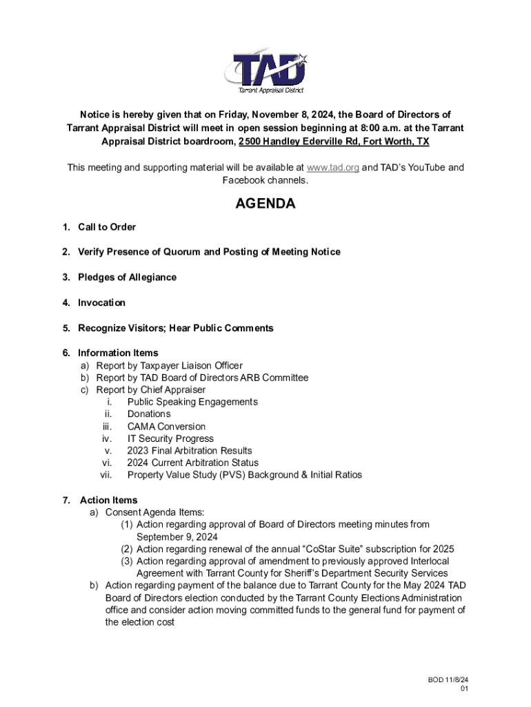 Notice is hereby given that on Friday, November 8, 2024, the Board of Directors of Tarrant Appraisal District will meet in open session beginning at 8:00 a.m. at the Tarrant Appraisal District boardroom,