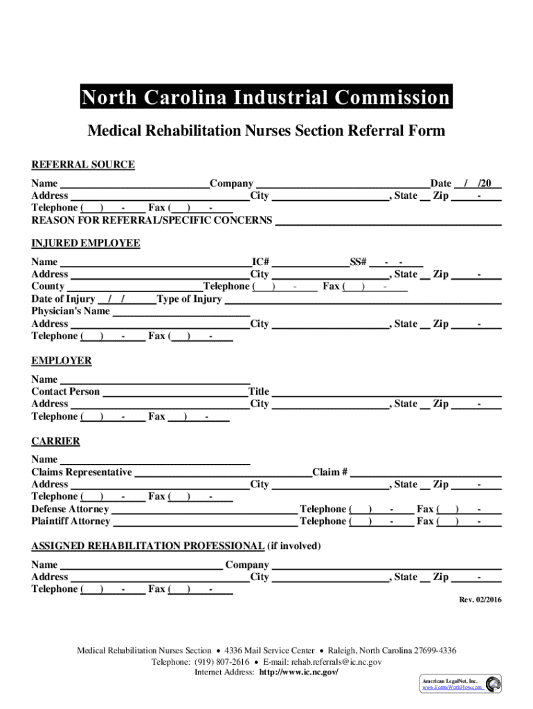 North Carolina Industrial Commission Medical Rehabilitation Nurses Section Referral Form REFERRAL SOURCE Name Company Address City Telephone ( ) Fax ( ) REASON FOR REFERRAL/SPECIFIC CONCERNS, StateDate