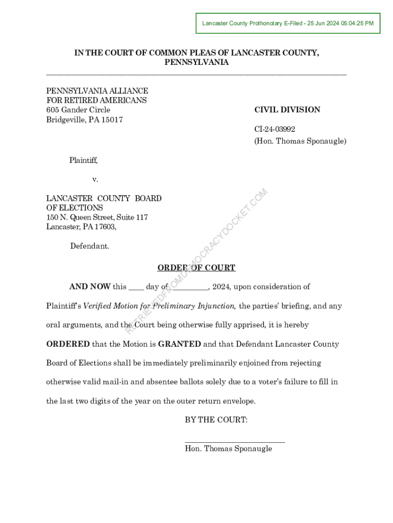 This document details a legal motion filed by the Pennsylvania Alliance for Retired Americans, seeking a preliminary injunction against the Lancaster County Board of Elections. The motion argues that the rejection of mail-in and absentee ballots due to the omission of the last two digits of the year violates the Pennsylvania Election Code and the state constitution\'s non-discrimination provision. The plaintiff aims to prevent disenfranchisement of voters who fail to write the last two digits...