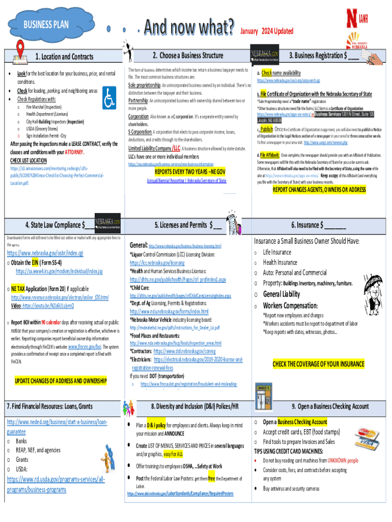 BUSINESS PLANJanuary 2024 Updated 2. Choose a Business Structure1. Location and Contracts Look for the best location for your business, price, and rental conditions. Check for loading, parking, and