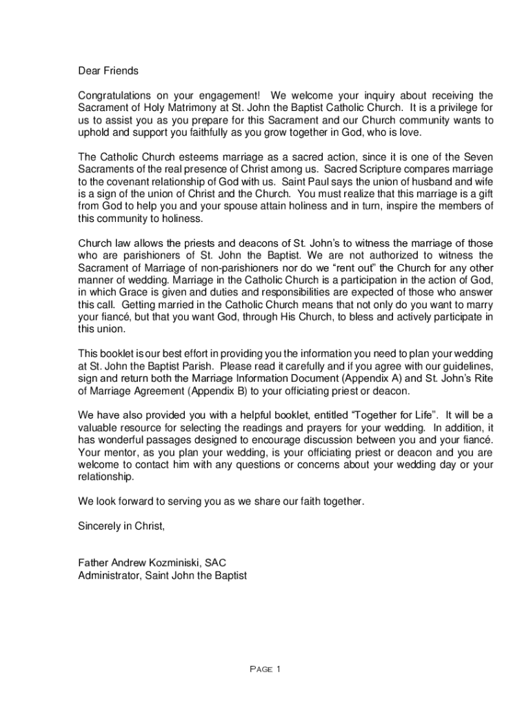 Dear Friends Congratulations on your engagement! We welcome your inquiry about receiving the Sacrament of Holy Matrimony at St. John the Baptist Catholic Church. It is a privilege for us to assist