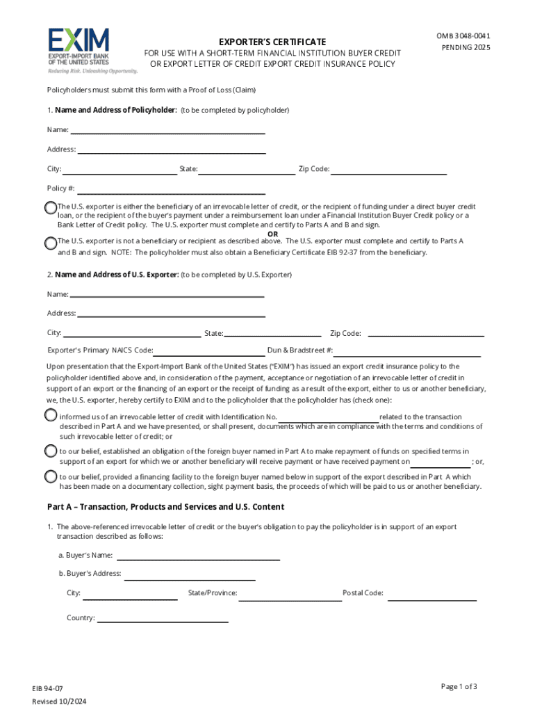 This document serves as a certification by the U.S. exporter regarding the terms and conditions associated with an irrevocable letter of credit or a buyer\'s obligation related to an exporttransaction, intended for use with short-term financial institution buyer credits or export credit insurance policies.