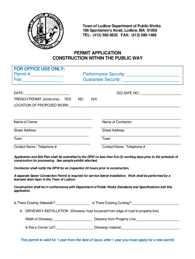 Town of Ludlow Department of Public Works 198 Sportsmens Road, Ludlow, MA 01056 TEL: (413) 5835625 FAX: (413) 5891488PERMIT APPLICATION CONSTRUCTION WITHIN THE PUBLIC WAY FOR OFFICE USE ONLY: Permit