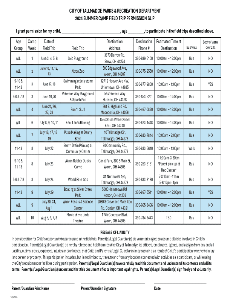 CITY OF TALLMADGE PARKS & RECREATION DEPARTMENT 2024 SUMMER CAMP FIELD TRIP PERMISSION SLIP I grant permission for my child, ___, age ___, to participate in the field trips described above. Age GroupCamp