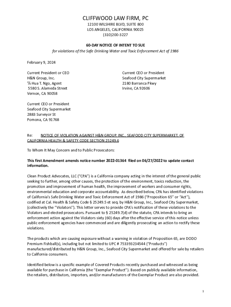 CLIFFWOOD LAW FIRM, PC 12100 WILSHIRE BLVD, SUITE 800 LOS ANGELES, CALIFORNIA 90025 (310)2003227 60DAY NOTICE OF INTENT TO SUE for violations of the Safe Drinking Water and Toxic Enforcement Act of