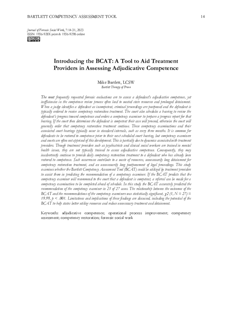 BARTLETT COMPETENCY ASSESSMENT TOOL Journal of Forensic Social Work, 7:1431, 2023 ISSN: 1936928X print & 19369298 onlineIntroducing the BCAT: A Tool to Aid Treatment Providers in Assessing Adjudicative