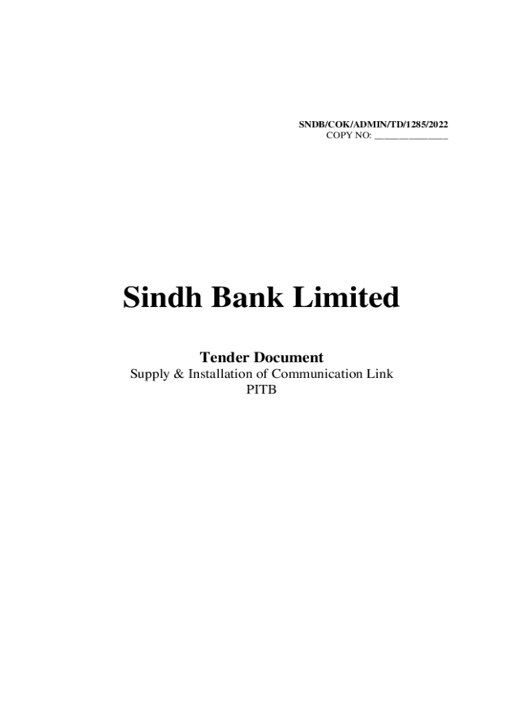 SNDB/COK/ADMIN/TD/1285/2022 COPY NO: ___Sindh Bank Limited Tender Document Supply & Installation of Communication Link PITBSindh Bank Limited Tender Document Supply & Installation of Communication