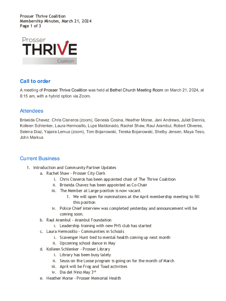 Prosser Thrive Coalition Membership Minutes, March 21, 2024 Page 1 of 3Call to order A meeting of Prosser Thrive Coalition was held at Bethel Church Meeting Room on March 21, 2024, at 8:15 am, with
