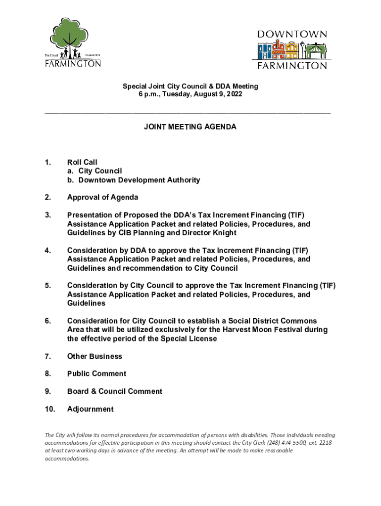 Special Joint City Council & DDA Meeting 6 p.m., Tuesday, August 9, 2022 ___JOINT MEETING AGENDA1.Roll Call a. City Council b. Downtown Development Authority2.Approval of Agenda3.Presentation of Proposed