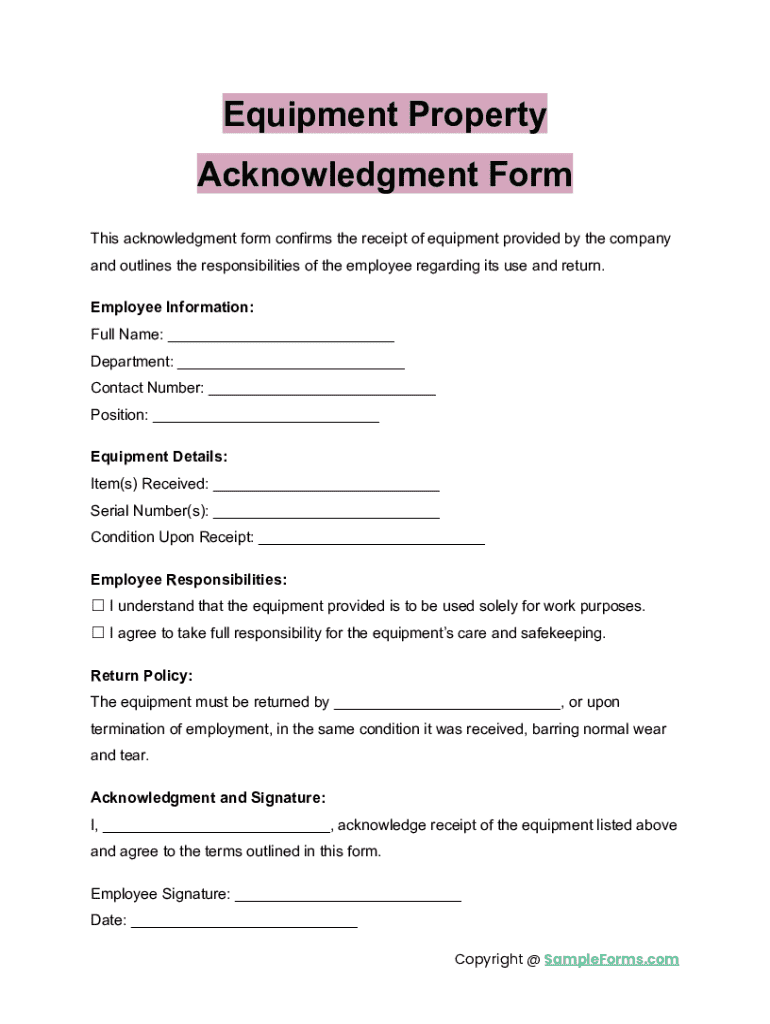 This form is used to acknowledge the receipt of company equipment and outlines the responsibilities of the employee for its use, care, and return.