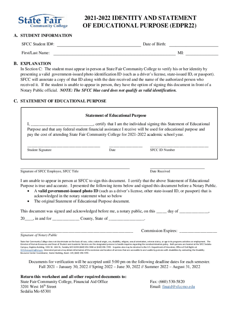 This document outlines the requirements for students at State Fair Community College to verify their identity and certify that federal student financial assistance will be used for educational purposes during the 2021-2022 academic year. It details the acceptable forms of identification and the processes involved in both in-person and notarized acknowledgments.