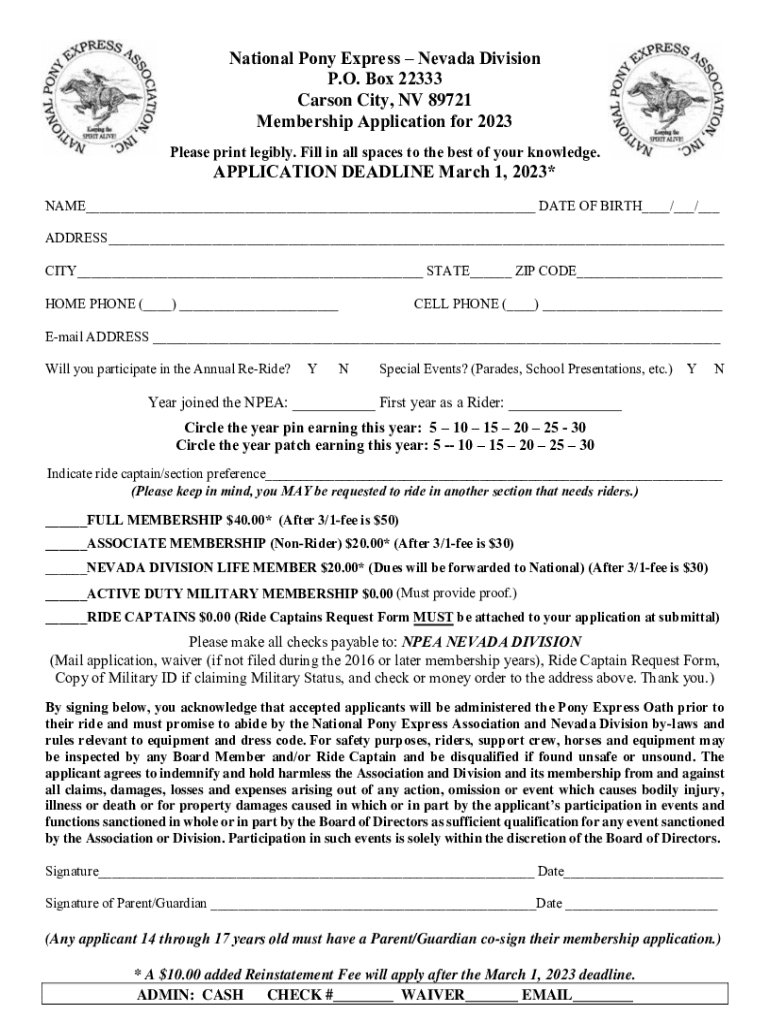 National Pony Express Nevada Division P.O. Box 22333 Carson City, NV 89721 Membership Application for 2023 Please print legibly. Fill in all spaces to the best of your knowledge.APPLICATION DEADLINE