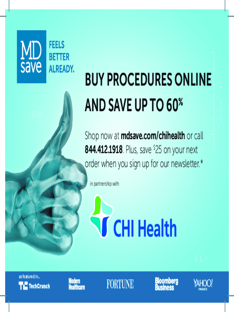 BUY PROCEDURES ONLINE AND SAVE UP TO 60% Shop now at mdsave.com/chihealth or call 844.412.1918. Plus, save $25 on your next order when you sign up for our newsletter.* in partnership withas featured