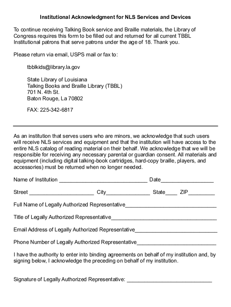 Institutional Acknowledgment for NLS Services and Devices To continue receiving Talking Book service and Braille materials, the Library of Congress requires this form to be filled out and returned