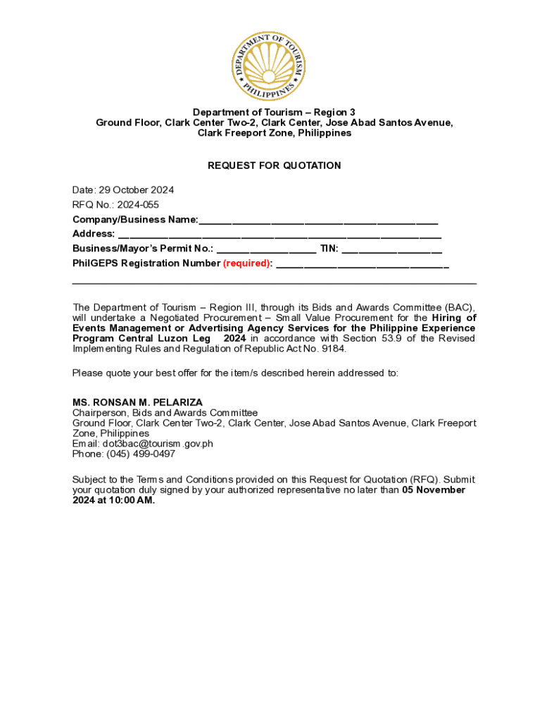 The Department of Tourism – Region III is seeking quotations for events management or advertising agency services for the Philippine Experience Program Central Luzon Leg 2024. This includes planning, producing promotional materials, and conducting digital promotions related to a series of cultural caravans celebrating the holiday season in Central Luzon from December 12 to 14, 2024.