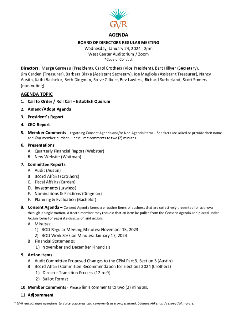This document outlines the agenda for the Board of Directors regular meeting scheduled on January 24, 2024. It includes topics such as roll call, reports from the President and CEO, committee reports, action items, and member comments.