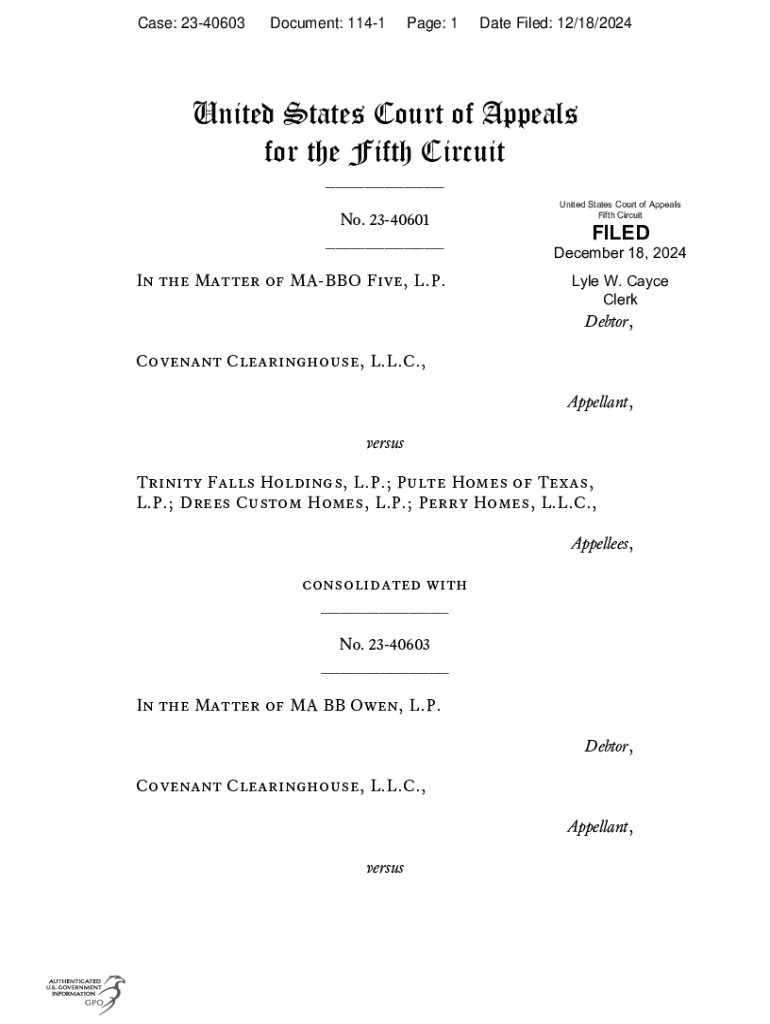 This document pertains to the appeal concerning Covenant Clearinghouse, L.L.C. against Trinity Falls Holdings, L.P., relating to a bankruptcy case involving the sale of properties without actual notice to the trustee of private transfer fees. The court affirms that Covenant Clearinghouse was neither a creditor nor a party in interest and thus was not entitled to actual notice, as the publication notice met due process requirements.