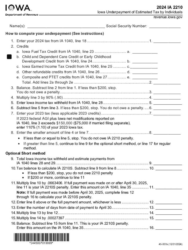 2024 IA 2210Iowa Underpayment of Estimated Tax by Individuals revenue.iowa.gov Name(s): ___ Social Security Number: ___ How to compute your underpayment (See instructions) 1. Enter your 2024 tax from