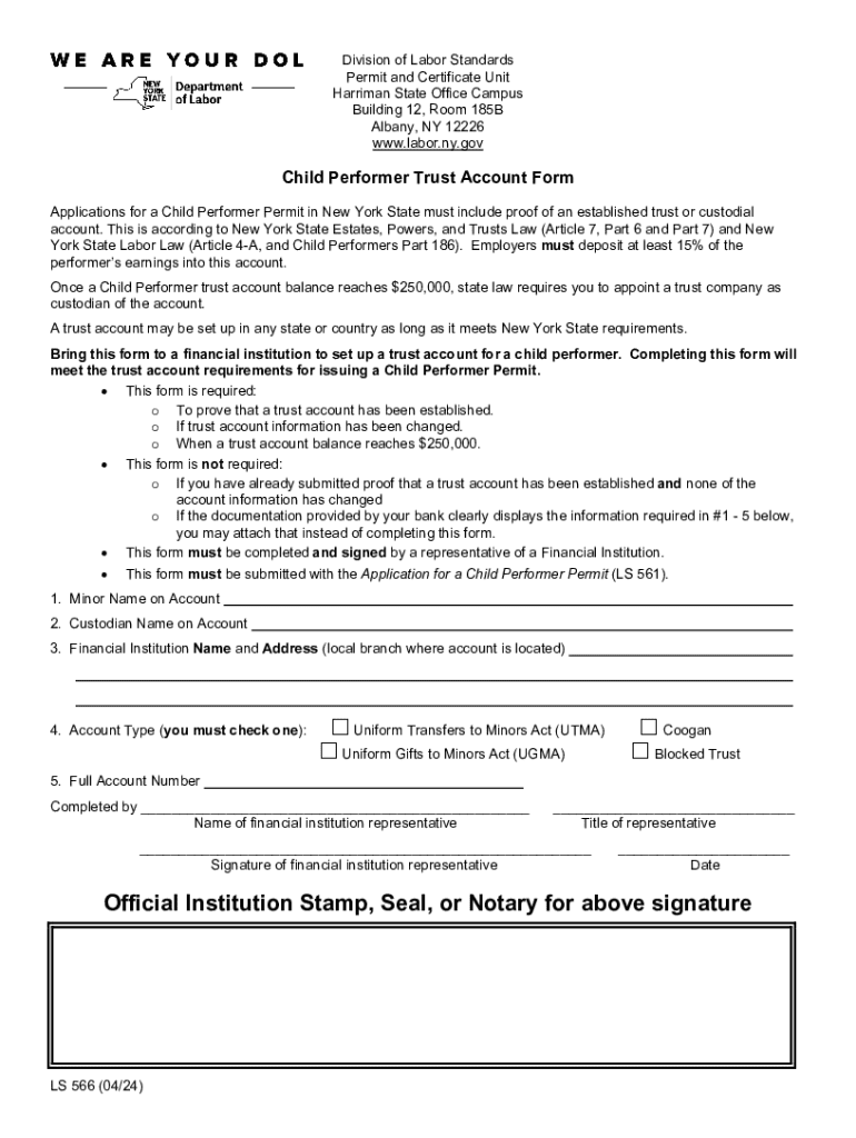 Get the free Child Performer Trust Account Form (LS566)