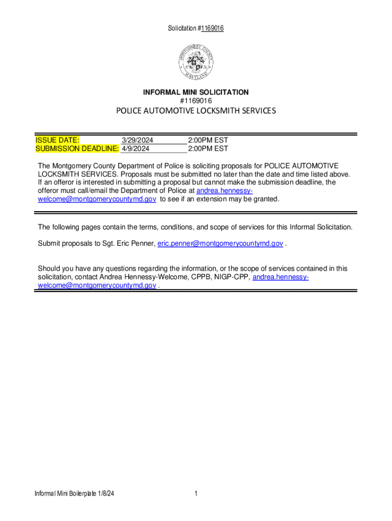 This document outlines the solicitation for proposals from local small businesses for Police Automotive Locksmith Services required by the Montgomery County Department of Police. It includes submission deadlines, service requirements, and terms for participating in this informal solicitation, specifically targeting qualified firms that meet local small business reserve program criteria.