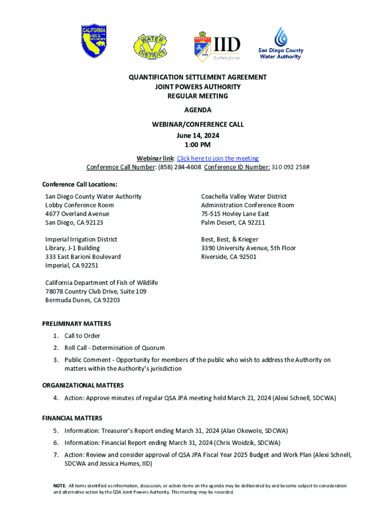 This document outlines the agenda for the QSA JPA regular meeting scheduled on June 14, 2024. It includes preliminary matters, organizational matters, financial reports, and updates on environmental mitigation measures related to the Quantification Settlement Agreement.