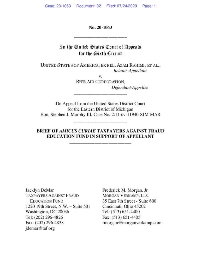 This document is a legal brief submitted by the Taxpayers Against Fraud Education Fund as amicus curiae in support of the appellant, Azam Rahimi, in a case regarding the interpretation of the False Claims Act. It discusses the implications of public disclosures on qui tam actions, the definition of original sources, and the historical context of the False Claims Act amendments.