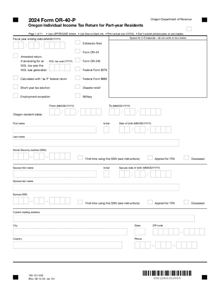 Clear form2024 Form OR40POregon Department of RevenueOregon Individual Income Tax Return for Partyear Residents Page 1 of 11 Use UPPERCASE letters. Use blue or black ink. Print actual size (100%).