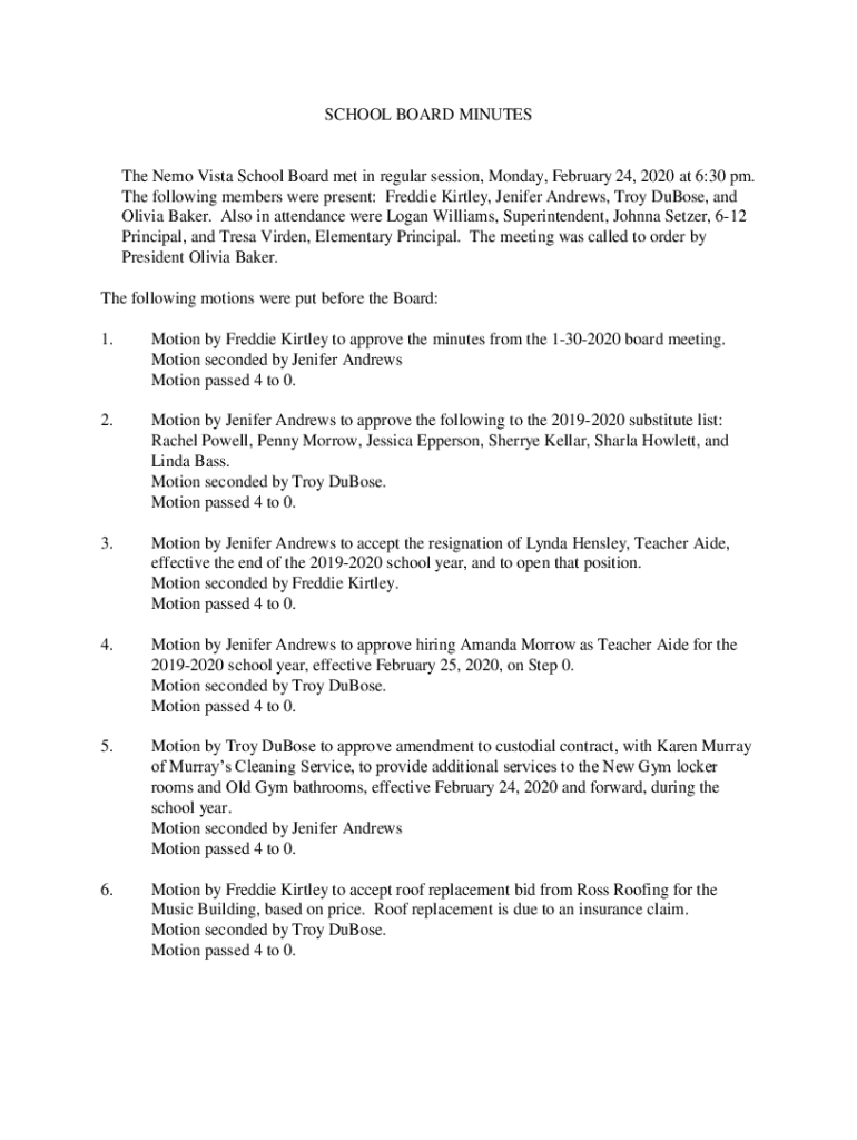 SCHOOL BOARD MINUTESThe Nemo Vista School Board met in regular session, Monday, February 24, 2020 at 6:30 pm. The following members were present: Freddie Kirtley, Jenifer Andrews, Troy DuBose, and