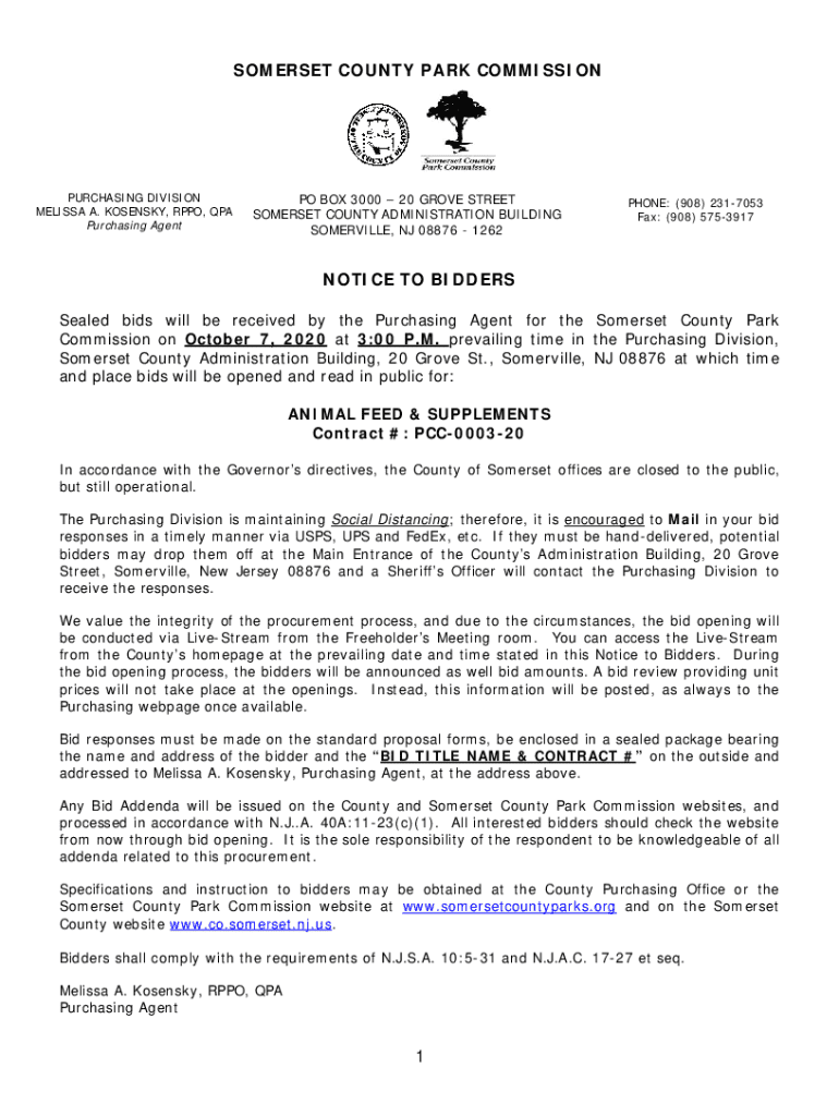 SOMERSET COUNTY PARK COMMISSIONPURCHASING DIVISION MELISSA A. KOSENSKY, RPPO, QPA Purchasing AgentPO BOX 3000 20 GROVE STREET SOMERSET COUNTY ADMINISTRATION BUILDING SOMERVILLE, NJ 08876 1262PHONE: