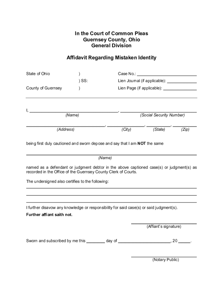 This affidavit serves to document and assert that the affiant is not the defendant or judgment debtor in cases or judgments recorded in Guernsey County. It aims to assist individuals facing adverse effects due to mistaken identity in lien filings, providing them a way to rectify their records.