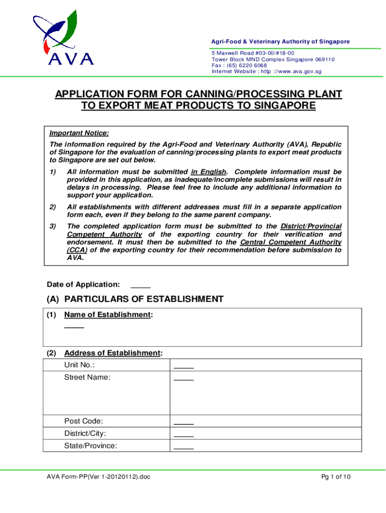 AgriFood & Veterinary Authority of Singapore 5 Maxwell Road #0300/#1800 Tower Block MND Complex Singapore 069110 Fax : (65) 6220 6068 Internet Website : http ://www.ava.gov.sgAPPLICATION FORM FOR