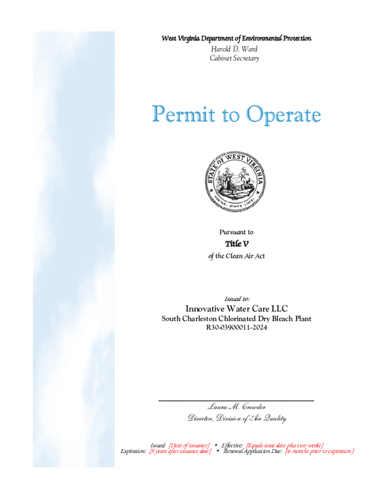 This document is a Title V Operating Permit issued to Innovative Water Care LLC for their South Charleston Chlorinated Dry Bleach Plant. It outlines the conditions under which the facility can operate, including compliance with the Clean Air Act and various emissions standards. The permit includes details on emission units, operational limitations, monitoring and reporting requirements, as well as renewal and compliance procedures.