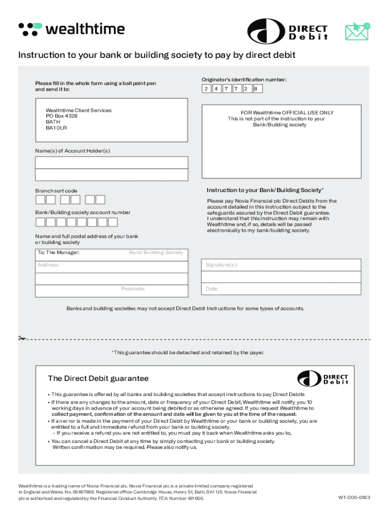 Instruction to your bank or building society to pay by direct debit Please fill in the whole form using a ball point pen and send it to:Originators identification number: 24Wealthtime Client Services