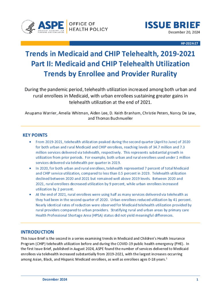 December 20, 2024 HP202427Trends in Medicaid and CHIP Telehealth, 20192021 Part II: Medicaid and CHIP Telehealth Utilization Trends by Enrollee and Provider Rurality During the pandemic period, telehealth