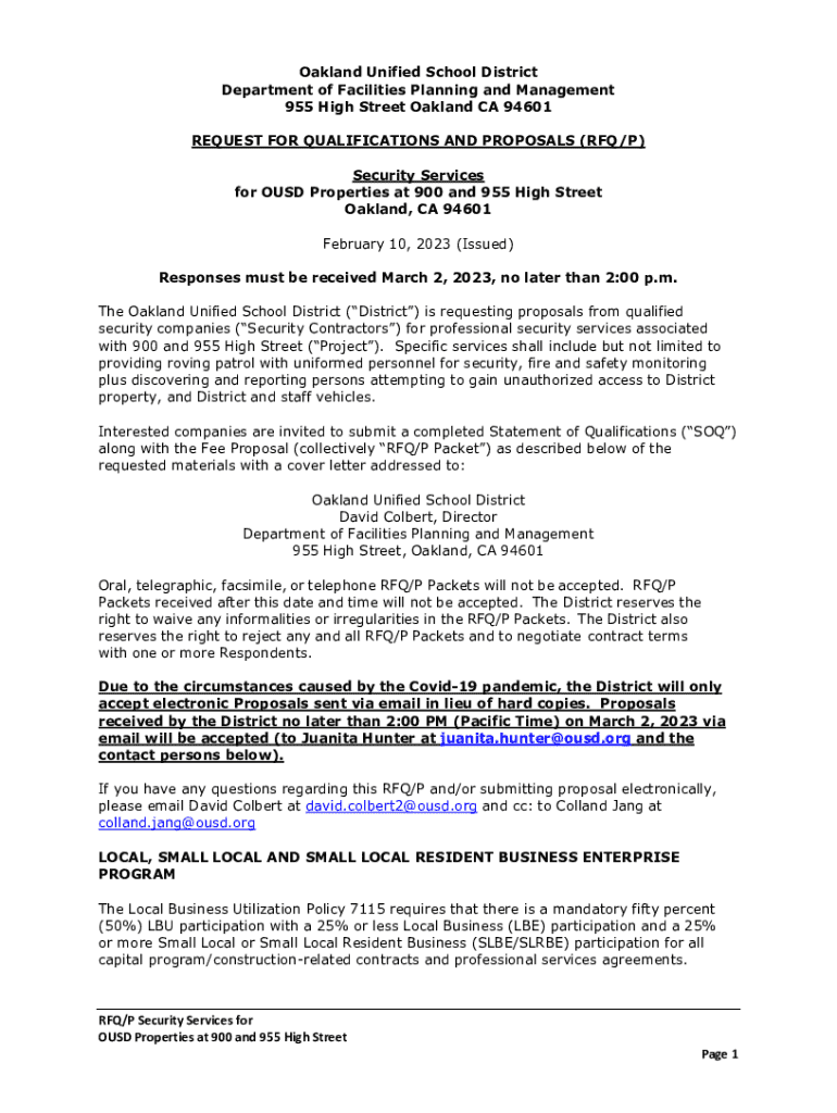 Oakland Unified School District Department of Facilities Planning and Management 955 High Street Oakland CA 94601 REQUEST FOR QUALIFICATIONS AND PROPOSALS (RFQ/P) Security Services for OUSD Properties