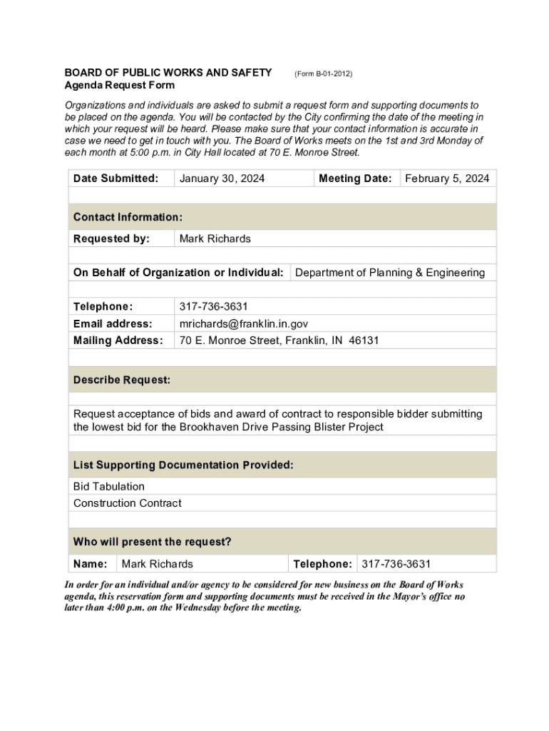 BOARD OF PUBLIC WORKS AND SAFETY Agenda Request Form(Form B012012)Organizations and individuals are asked to submit a request form and supporting documents to be placed on the agenda. You will be