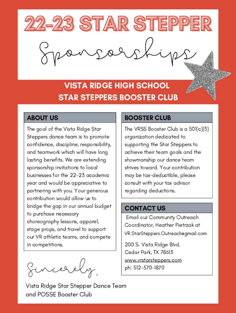 This document serves as an invitation for local businesses to sponsor the Vista Ridge Star Steppers dance team for the 22-23 academic year. It details the mission of the dance team, sponsorship packages, benefits for sponsors, and contact information for inquiries.