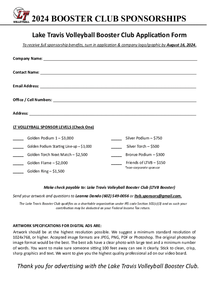 This document outlines sponsorship opportunities for the Lake Travis Volleyball Booster Club for the year 2024. It details various sponsorship levels, benefits associated with each level, and guidelines for application submission. Sponsors can provide their company logo and will receive advertising benefits during volleyball matches.