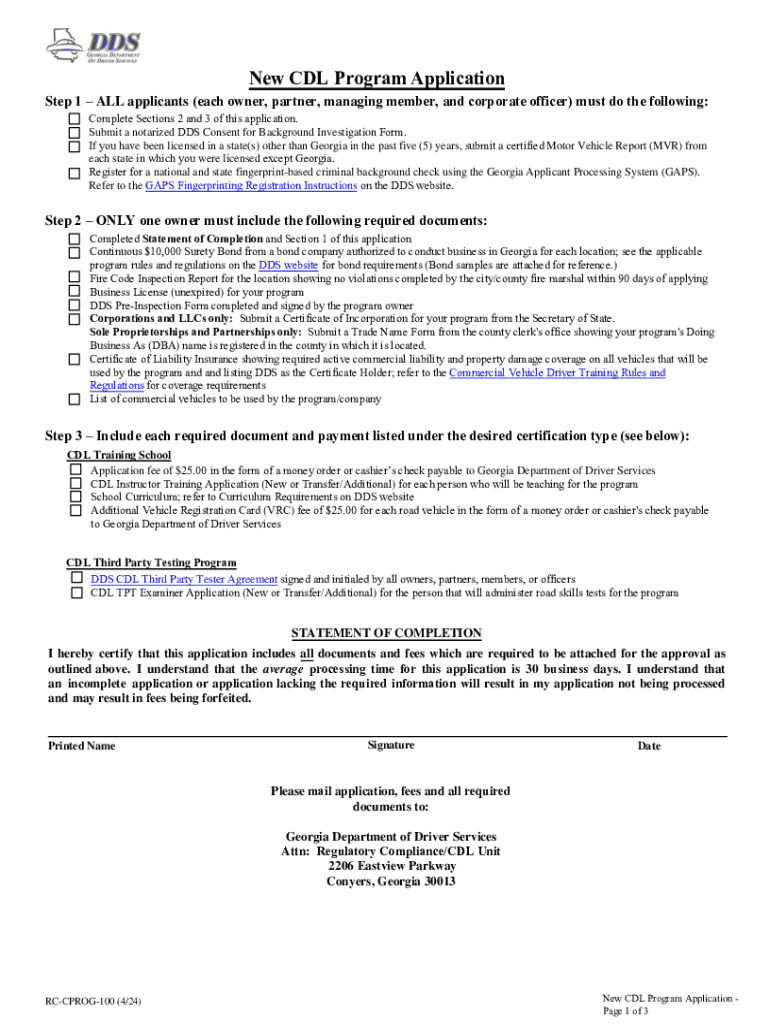 New CDL Program Applicaon Please carefully review all requirements on the next page before compleng the applicaon.Regulatory Compliance Division Georgia Department of Driver Services **This application